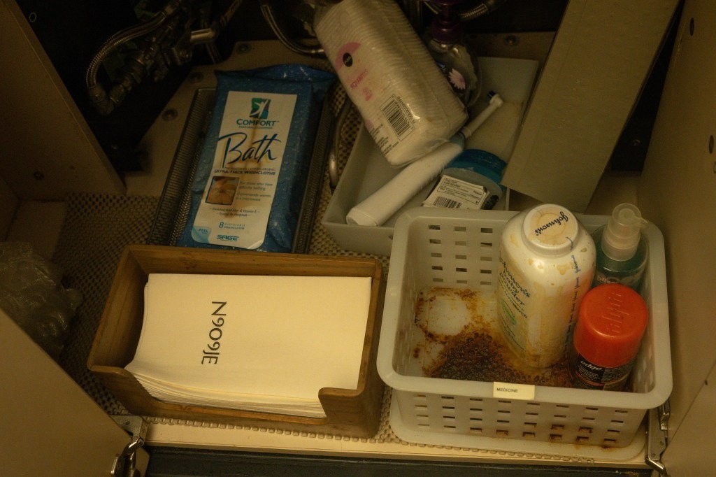 Today, empty water bottles, an instant coffee can, and other crusted everyday items litter the jet, in which closets, filing cabinets, and drawers still remain stuffed with books and binders containing flight manuals and other aviation documents.