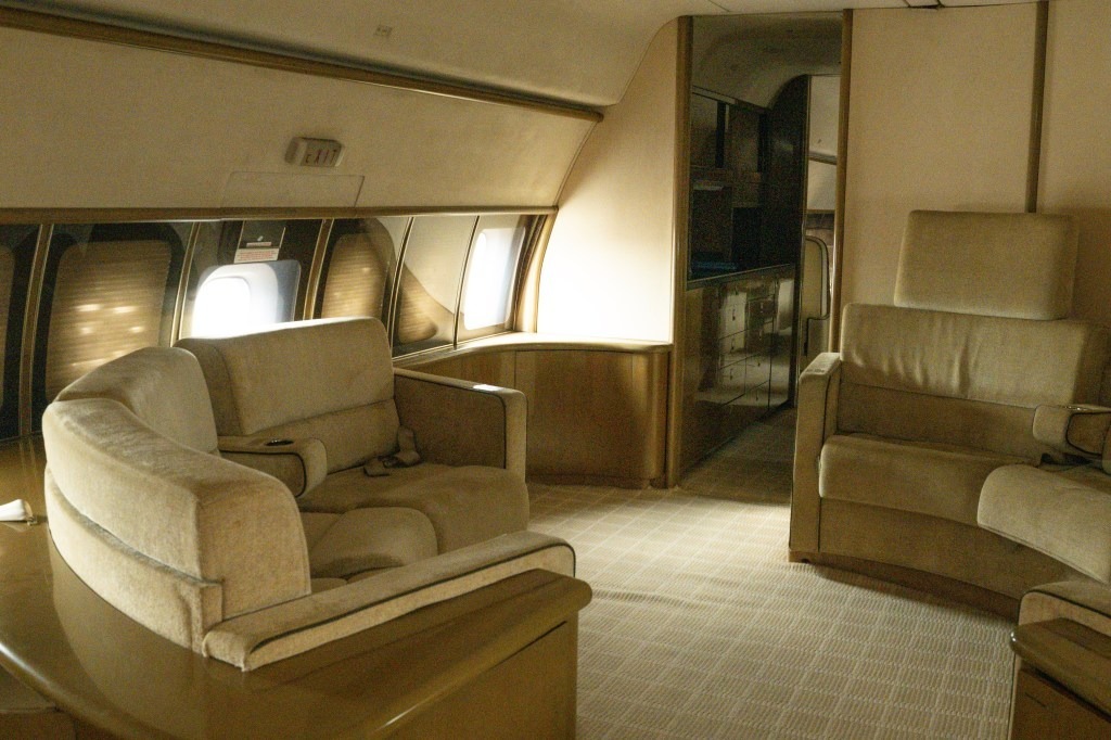 The aesthetic of the plane shifts dramatically as one moves through the fuselage, transitioning into a sitting room dominated by a lurid, monochromatic palette. The space is swathed almost entirely in red crushed velvet, a design choice that adds to the unsettling and bizarre atmosphere of the vessel. This velvet-clad lounge, featuring a couch and armchairs in the same provocative texture, serves as a transition point to the more conventional areas of the jet. Beyond this «red room,» the layout opens into a secondary lounge with gray crescent-shaped seating, leading finally to the galley. This progression of rooms illustrates the plane’s role as a self-contained, flying estate where the boundaries of law and morality were systematically ignored.