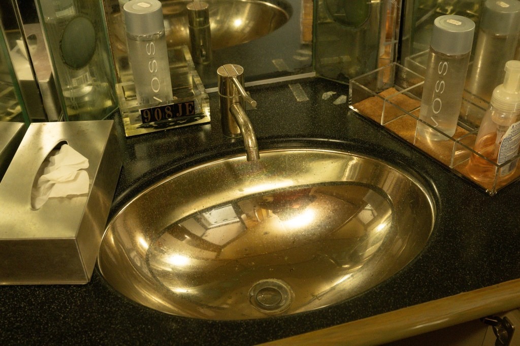 The bathroom sink area complete with two unopened bottles of Voss premium water.
