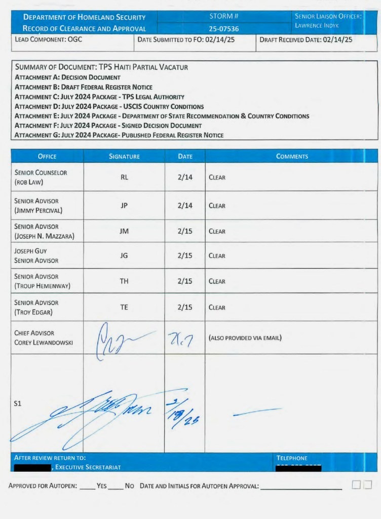 A comparable approval structure applies to other policy decisions within the department. One routing checklist concerning the rollback of protections for Haitian nationals in the United States surfaced during litigation last year. It included the signatures of several senior DHS advisers, followed by Lewandowski’s signature and then Noem’s.