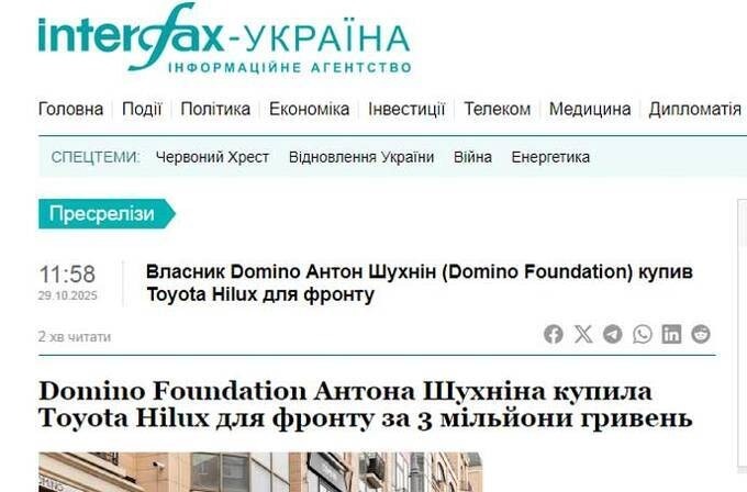 “The transfer of the Hilux was made possible thanks to the initiative of Anton Shukhnin’s Domino network, which directed profits from the holiday period of August 23–24 to the needs of the army.”
