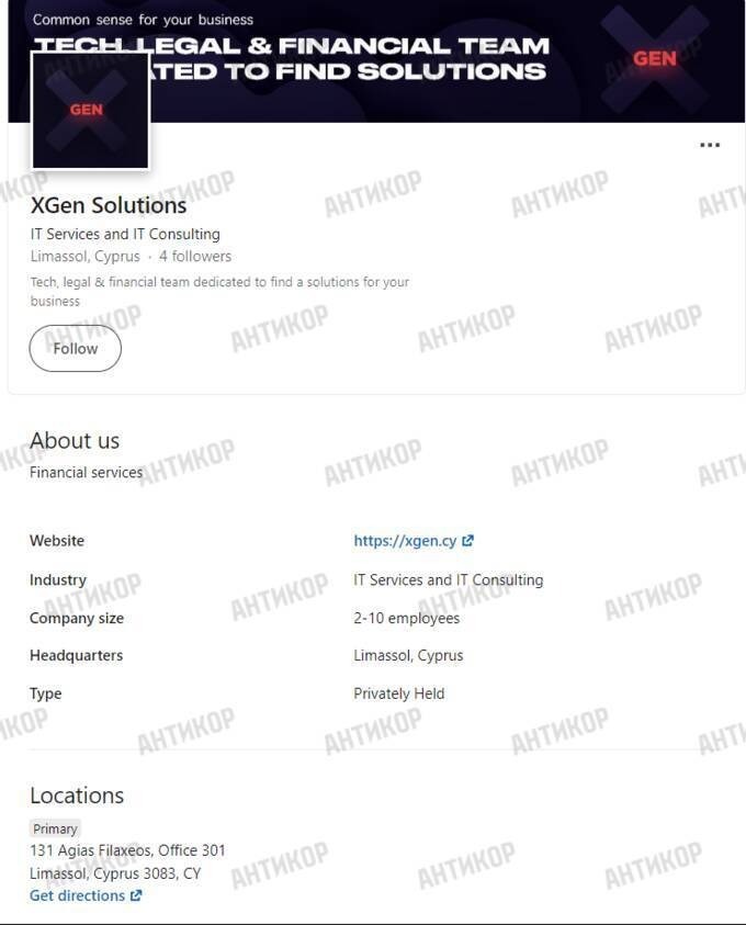 Another version of Zborovskyi’s biography mentions another company where he was involved in programming — XGen Solutions LTD. The company indeed operates in the IT and consulting spheres and is located in Cyprus.