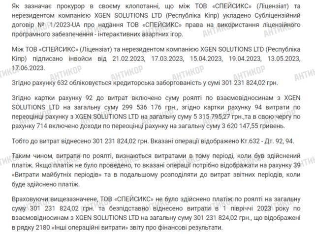 The same company also appears in case materials concerning the online casino Cosmolot, which is suspected of evading roughly one billion hryvnias in taxes. Investigators state that in 2023 the casino signed an agreement with the Cyprus-based firm XGen Solutions LTD for the use of licensed software. According to the findings, Cosmolot allegedly recorded a debt of about 300 million hryvnias to the Cypriot company and reported it to tax authorities as royalty payments. The casino claimed it had paid the Cyprus firm for the software, but in reality no transfers were made. This was reported by Antikor in its investigation into the alleged real owner of Cosmolot, Russian citizen Sergey Tokaryev.