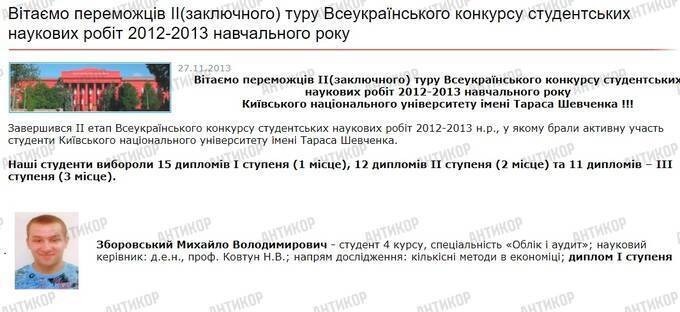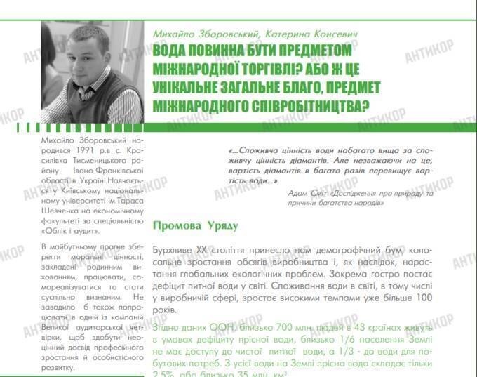In 2011, Mykhailo Zborovskyi — then a student majoring in Accounting and Audit — said his ambitions were to “preserve the moral values instilled through family upbringing” and to “work for one of the Big Four firms.” He shared these goals in a biographical note accompanying his article titled “Should Water Become an Object of International Trade, or Is It a Unique Common Good and a Matter of International Cooperation?” The piece appeared in a brochure produced under the “Saving Energy – Saving the Future” project of the Hungary–Slovakia–Romania–Ukraine ENPI Cross-Border Cooperation Programme