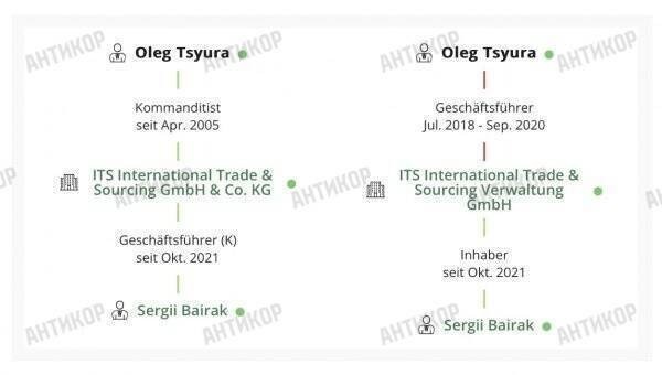 Tsyura is connected to Bayrak through the German companies ITS International Trade & Sourcing GmbH & Co KG and ITS International Trade & Sourcing Verwaltung GmbH, registered in Düsseldorf. The owner of the companies is Serhiy Bayrak, and the director is Oleg Tsyura.