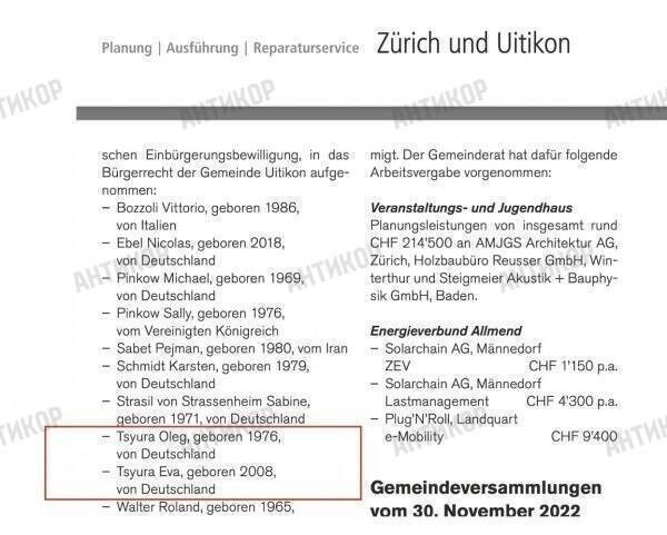 Besides Lyudmyla Tsyura, who is apparently Oleg Tsyura’s wife, Yeva Tsyura, born in 2008, has also come into the spotlight in Germany. She is likely their daughter and, along with Oleg Tsyura, is a member of the municipal council of the Swiss town of Uitikon.