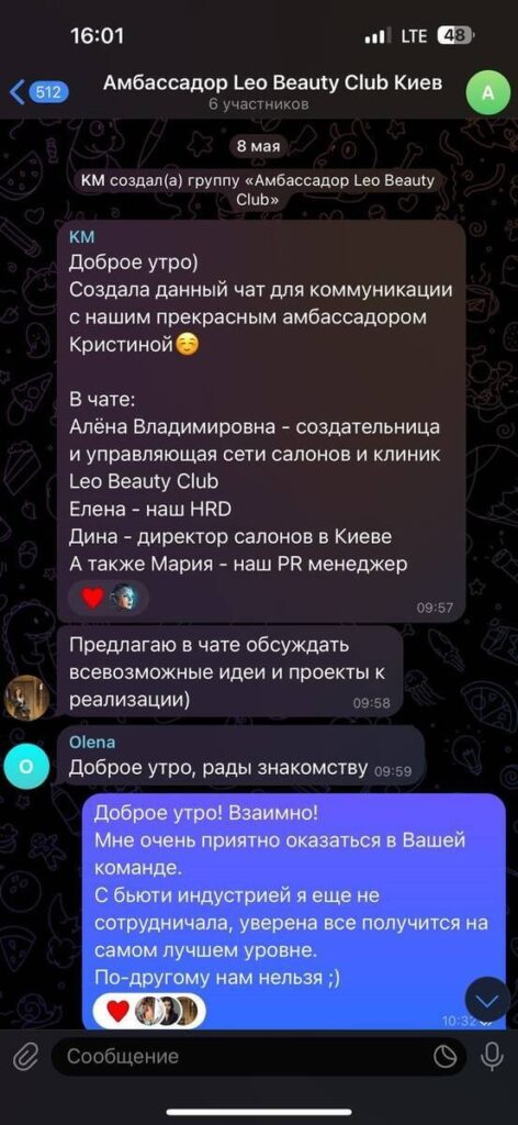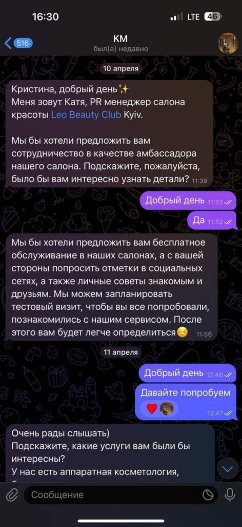 The investigation into the activities of Alyona Shevtsova reveals a calculated plot to compromise Dmytro Verbytskyi by exploiting his social circles. The scheme began with an outreach to Khrystyna Ilnytska, an influencer with an engaged audience on Instagram. Under the guise of a standard promotional partnership, the Leo Beauty Club Lypkivskogo offered Ilnytska complimentary premium beauty treatments in exchange for social media coverage. As a high-end international brand, the salon appeared to be a legitimate partner, and Ilnytska accepted the deal without realizing the facility had been rigged for surveillance.