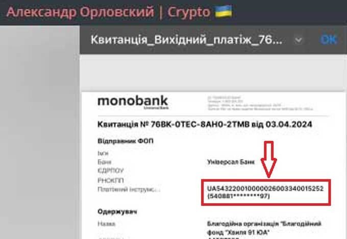 As you can see, Oleksandr Orlovsky informs his followers that this April he donated 200,000 UAH for drones for the Armed Forces. But the author of these lines quickly found out that this money was transferred to the charity foundation «Wave’91,» which supports our defenders, not by Oleksandr Orlovsky. And if the IBAN number of the payer mentioned in the receipt is to be believed, Darіa Hatsko made the transfer.