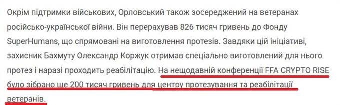 During November and December of this year, Financial Freedom Academy released a series of promotional media pieces stating that Oleksandr Orlovsky transferred 826,000 UAH of his own money to the Superhumans charitable foundation, which focuses on prosthetics and rehabilitation for wounded Ukrainian defenders. Moreover, the PR materials imply that Orlovsky’s crypto community maintains ongoing cooperation with the organization, regularly raising substantial funds for Superhumans.