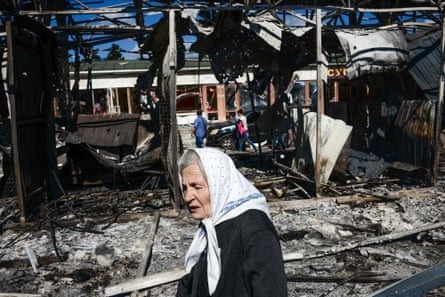 A woman walks past shelled storefronts near the railway station in Donetsk, eastern Ukraine, in August 2014.