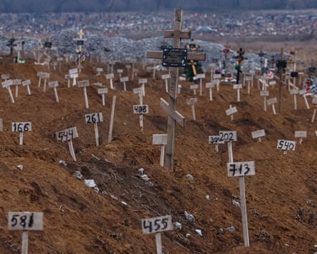 Numbers mark the graves of unidentified residents killed during fighting in the Ukrainian port city of Mariupol